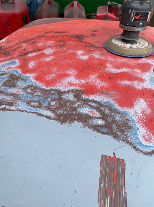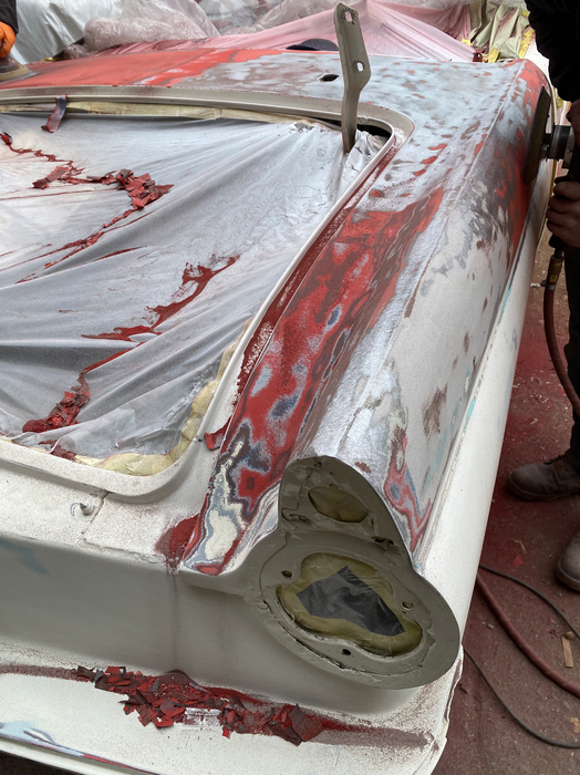 Front end disassembly, front end work, body work & paint; assembly, polish; rear end disassembly, body work, set doors, strip trunk lid, top of rear fenders, filler & blocking, body work, put in primer, paint rear of car, assembly, wet sand and polish.
